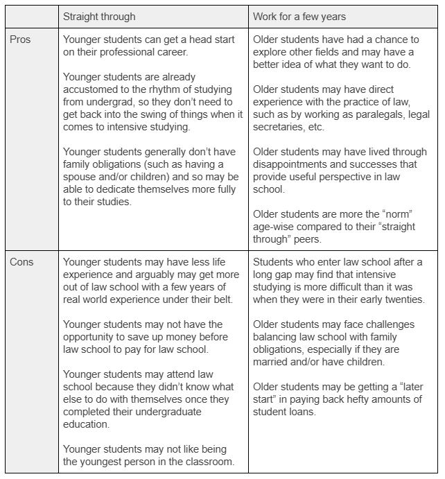 Before I talk about the pros and cons of going “straight through” (graduating from undergrad in the spring and immediately going to law school that fall), I want to reassure you that the only timeline that matters is your own!